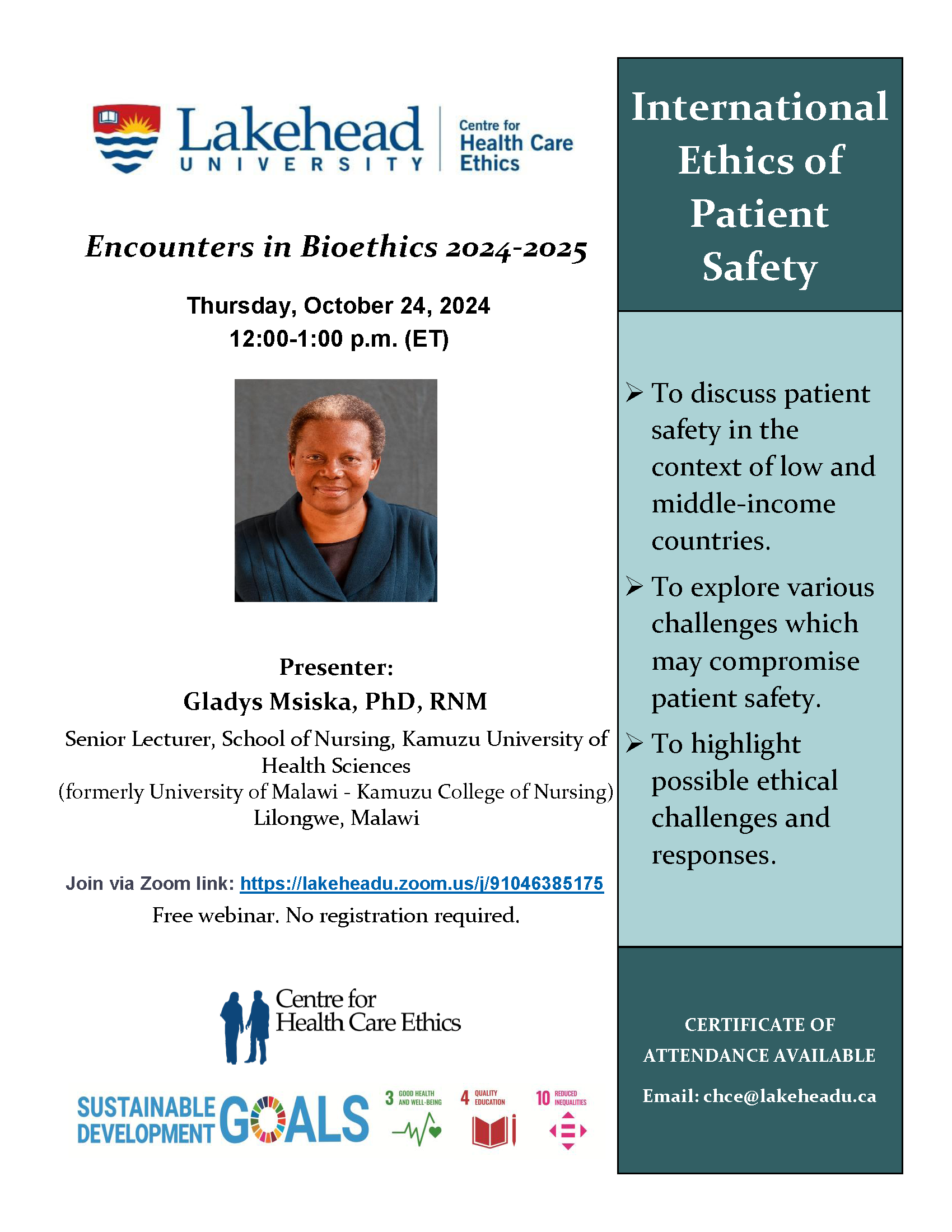 Encounters in Bioethics 2024-2025 offers a free webinar "International Ethics of Patient Safety" on Thursday, October 24, 2024, 12:00-1:00 pm (ET). The session will be presented by Gladys Msiska, PhD, RNM. Explore the challenges compromising patient safety in low and middle-income countries and shed light on the ethical dilemmas and potential solutions.