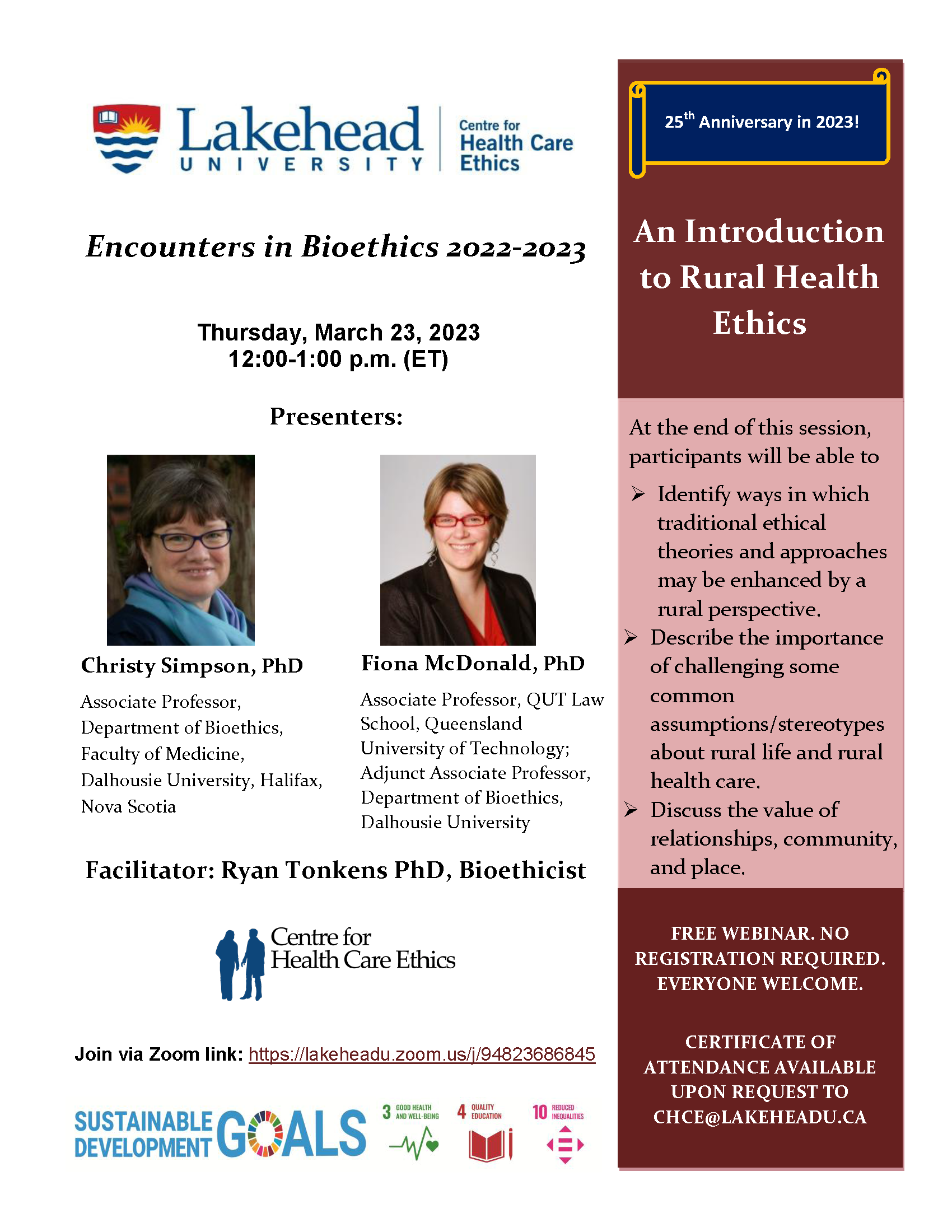 Encounters in Bioethics 2022-2023 offers a free webinar "An Introduction to Rural Health Ethics" on Thursday, March 23, 2023, 12:00-1:00 p.m. (ET) with presenters Christy Simpson, PhD, Associate Professor, Department of Bioethics, Faculty of Medicine, Dalhousie University and Fiona McDonald, PhD, Associate Professor, QUT Law School, Queensland University of Technology & Adjunct Associate Professor, Department of Bioethics, Dalhousie University.
