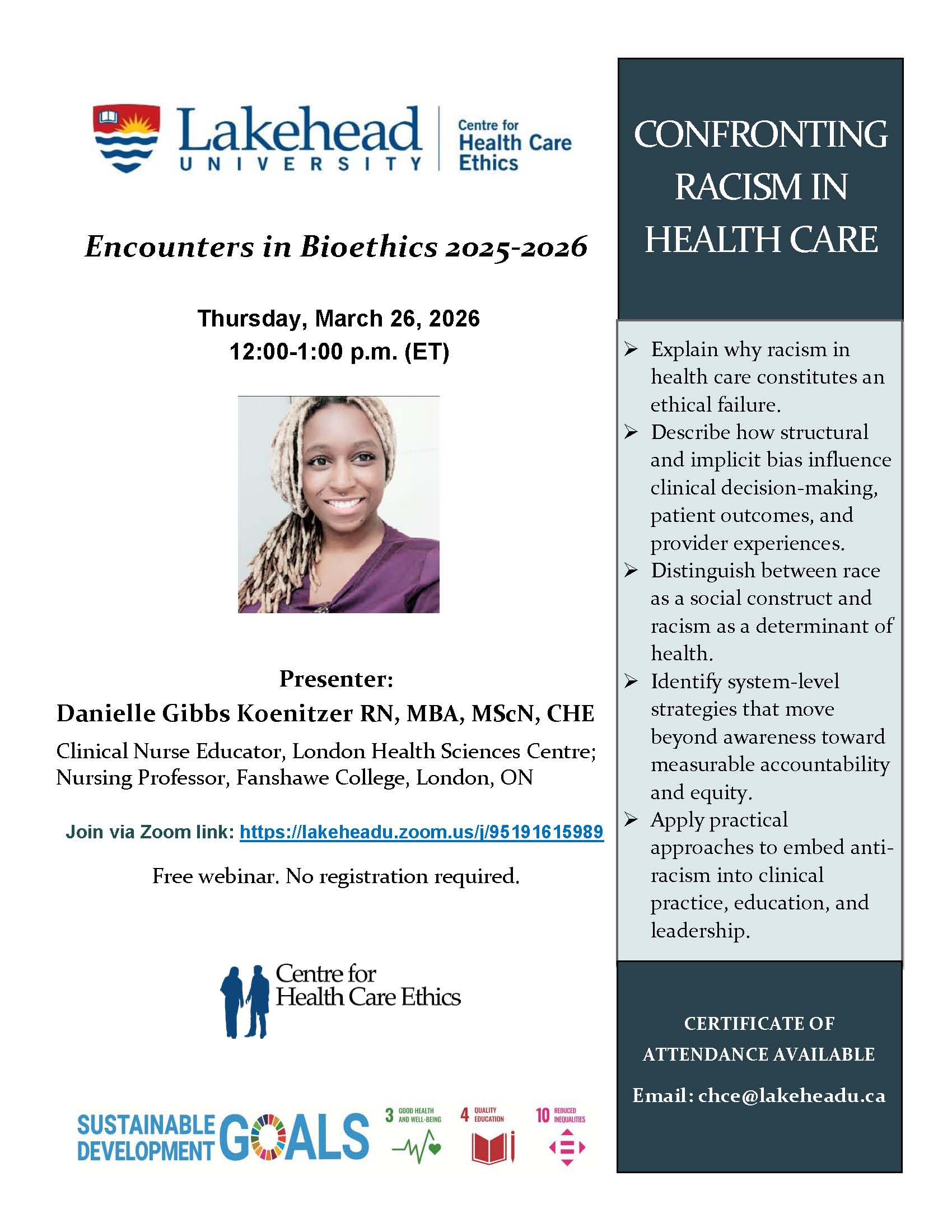 Encounters in Bioethics 2025-2026 offers a free webinar "Confronting Racism in Health Care" on Thursday, March 26, 2026, 12:00-1:00 pm (ET).